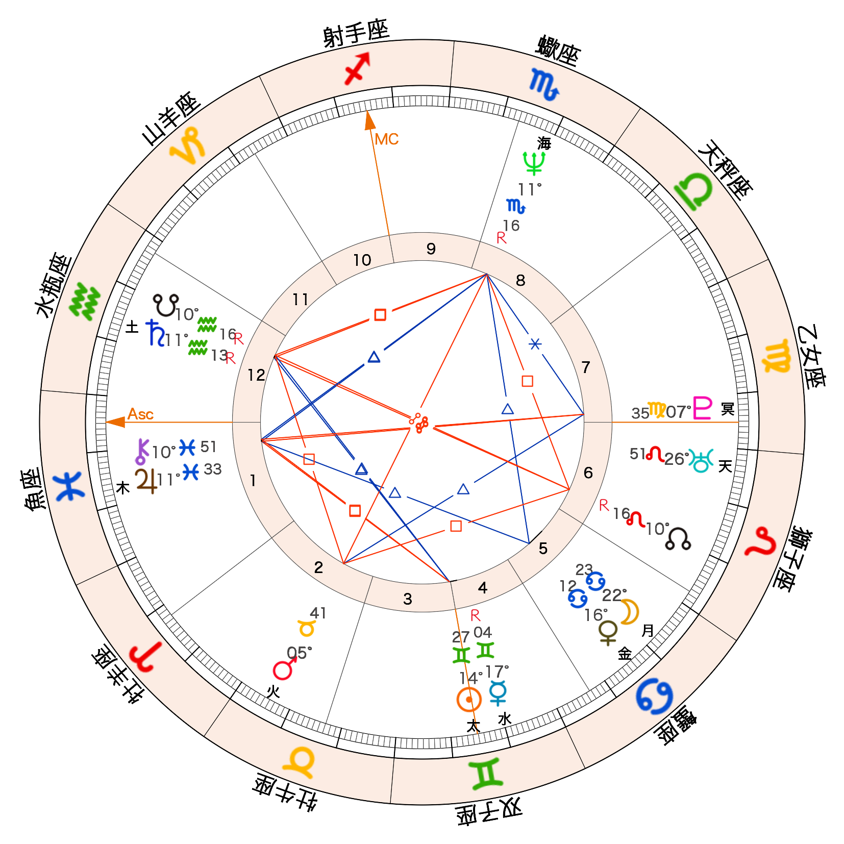 これらのアスペクトは、花とアリスを手がけた、映画監督の岩井俊二さんと同じです。岩井監督も同じく蠍座や海王星、魚座や木星が特徴的です。