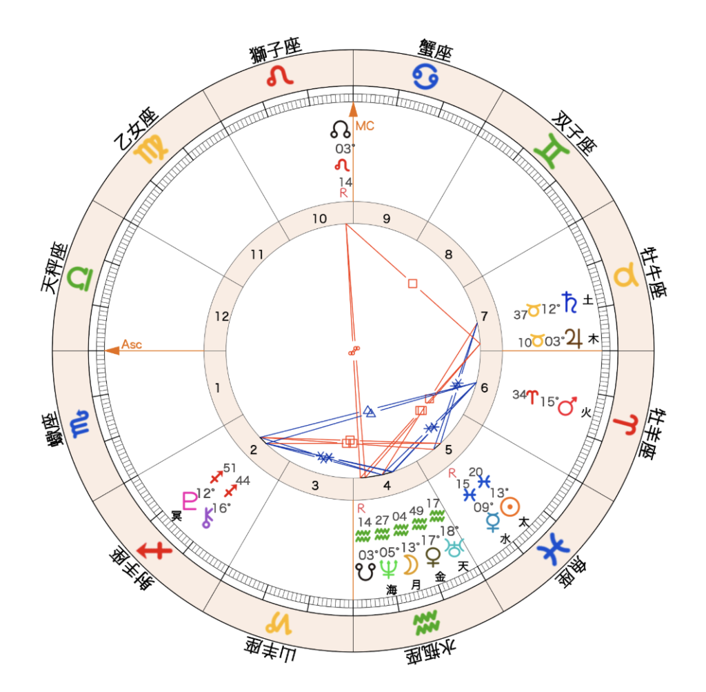 インド占星術では、5ハウスにケートゥ(テイル)が位置すると、語学の才能と同時に占星術の適正も示す内容が書かれています。このチャートは時刻不明で、ハウスは見れませんが、テイルが水瓶座の金星や月、天王星や海王星、ジュノーと合を形成しています。しかもこの方は、四柱推命で見ると印綬が三つあります。印綬は学びの他、祖国を示しますが、複数ある場合は、偏印の質が現れます。偏印は外に出る学びも表します。