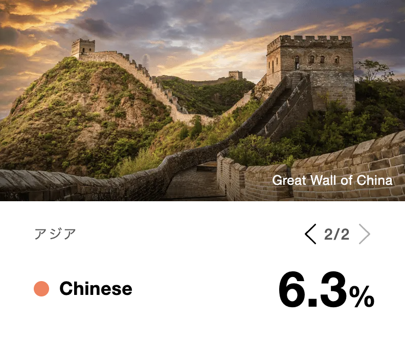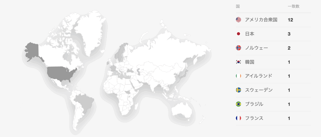 試してみると、遠い親戚である可能性が高い人、可能性が低い人とグラフ分けされている。アメリカに住むアジア系の男性2名女性2名、ノルウェーに住むアジア系の女性1名と、遠い親戚であると書かれている。それでも、遺伝子のシェア率は1%もない程である。他にも中程度、小程度の可能性と書かれている人たちを含むと、上記のような世界図になる。