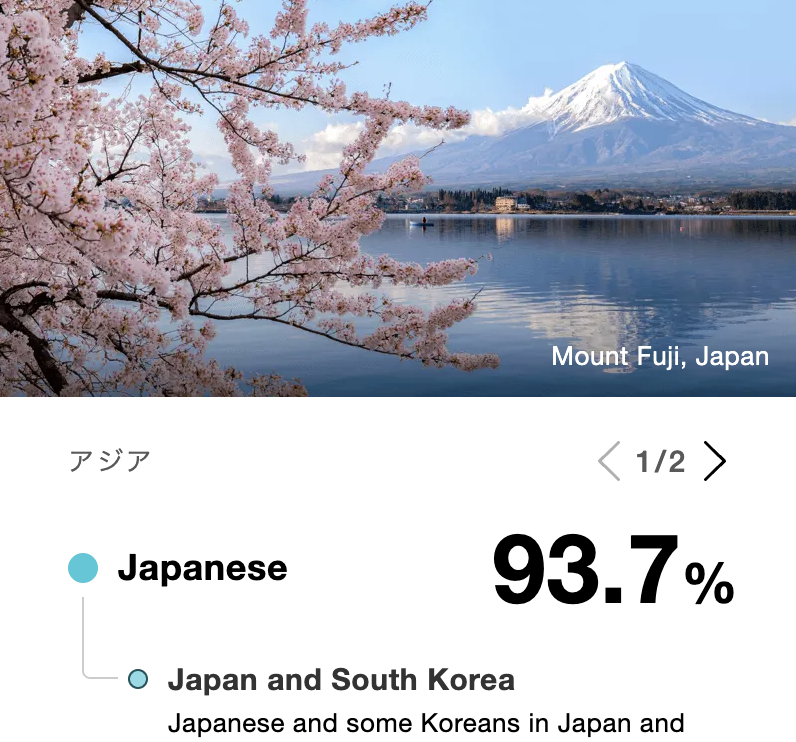 日本人のDNAはこのように日本人と韓国人と一括で纏められている。でも、場合によっては比率や地域などの詳細を見ることができるようだ。また、100%日本人という人は少なめのようで、殆どの人に数パーセントくらいは日本以外の遺伝子も入っているようだ。
